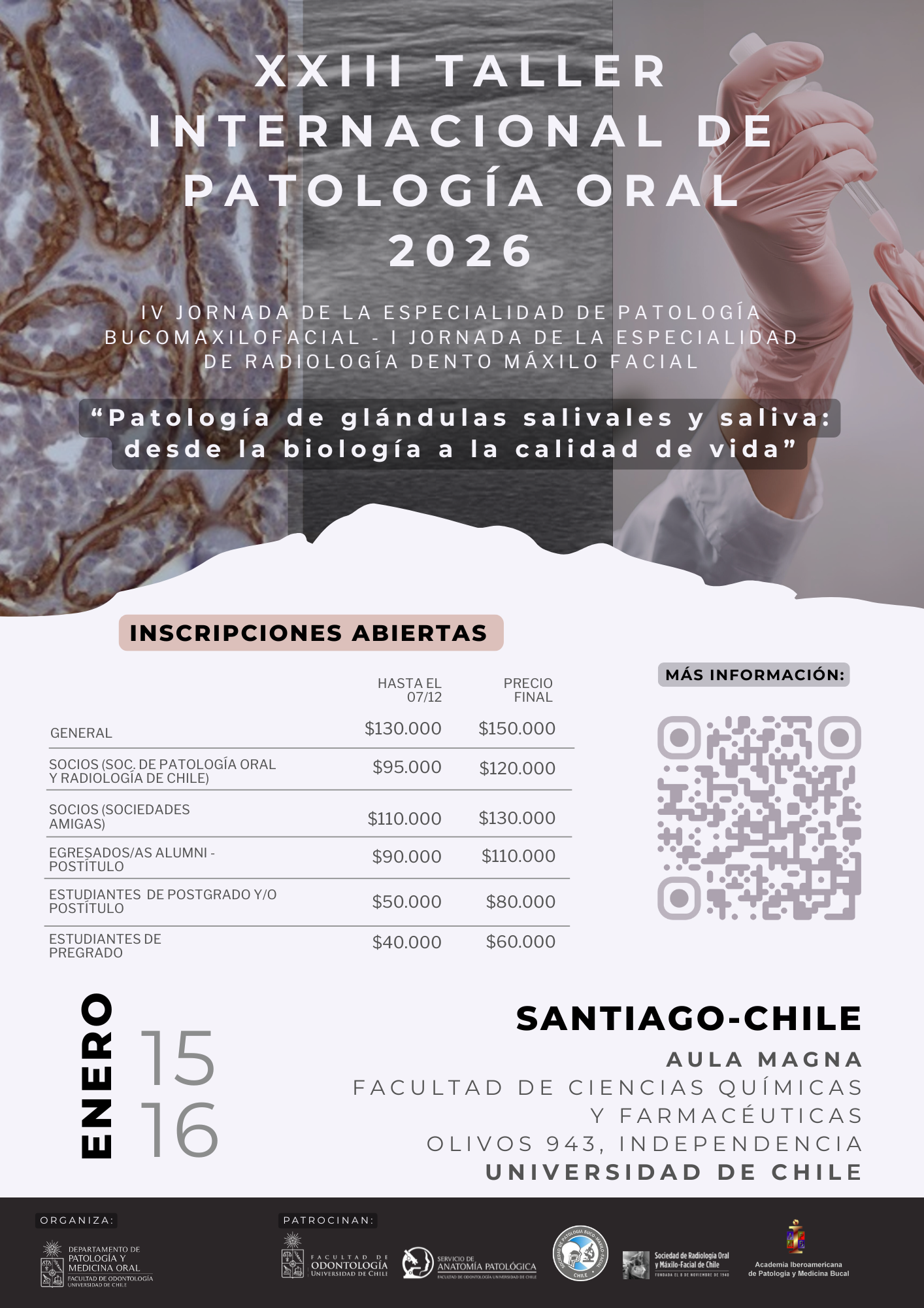 Nos dirigimos a Uds. para invitarles a asistir al XXIII Taller Internacional de Patología Oral y IV Jornada de la Especialidad de Patología Buco Maxilofacial de la Facultad de Odontología de la Universidad de Chile titulado: “Patología de glándulas salivales y saliva: desde la biología a la calidad de vida” que se realizará los días 15 y 16 de enero 2026 en la ciudad de Santiago de Chile. Participarán destacados exponentes de Iberoamérica y la invitada principal es la Dra. Alena Skálová, destacadísima Patóloga médica quien ha descrito nuevos tumores de glándulas salivales y es responsable del capítulo de tumores de glándulas salivales del libro de la Organización Mundial de la Salud OMS 2022. Estamos seguros de que esta actividad contribuirá a promover el desarrollo de la patología y medicina bucal en Iberoamérica junto a la colaboración y comunicación de los profesionales que trabajamos en este ámbito de la salud, objetivos fundamentales de la AIPMB.